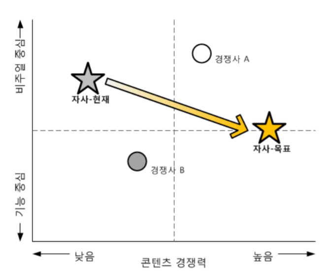 [그림 3-2] 콘텐츠 경쟁력과 비주얼중심/기능중심 이라는 제품 특성을 기준으로 위치를 파악해 ‘제품의 기능성을 강화하여 기능과 비주얼 요소 균형을 맞추고 콘텐츠를 강화하여 시 장 우위에 선다.“라는 전략 기술 후 현재 시장에서의 위치와 목표 위치를 설정한 포 지셔닝 맵의 예.