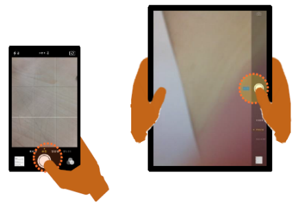 Phone과 Tablet의 카메라 촬영 버튼위치를 참고하여 보면, 크기가 큰 Tablet은 양손으 로 양측면을 잡게 되어 Phone과의 그립 방식이 다르다.