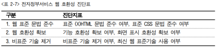 웹사이트가 작동하는 서비스 이용자 단말기(PC, 모바일기기 등)의 하드웨어 및 소프트웨 어 환경이 다른 경우에도 동등한 서비스를 제공하는 것을 말한다. 전자정부서비스 웹 호 환성 지침은 행정기관 및 공공기관이 전자정부서비스의 호환성 확보를 위해 지켜야 할 사 항을 규정함을 목적으로 한다.